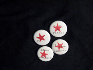 pinko communoids buttons: the production process involves two steps. Step one consists of rubber stamping a red star and type-writing a short phrase around the star on a letter-sized white paper. Step two involves manual button-making by Sara Danielson, button-maker extraordinaire.